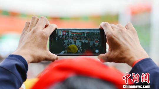 近年,西藏藏戲得到快速發(fā)展,展演活動越來越多。圖為8月30日,拉薩雪頓節(jié)藏戲展演活動上,一名外圍觀眾因無法觀看到表演,只好高舉手機進行記錄。江飛波 攝