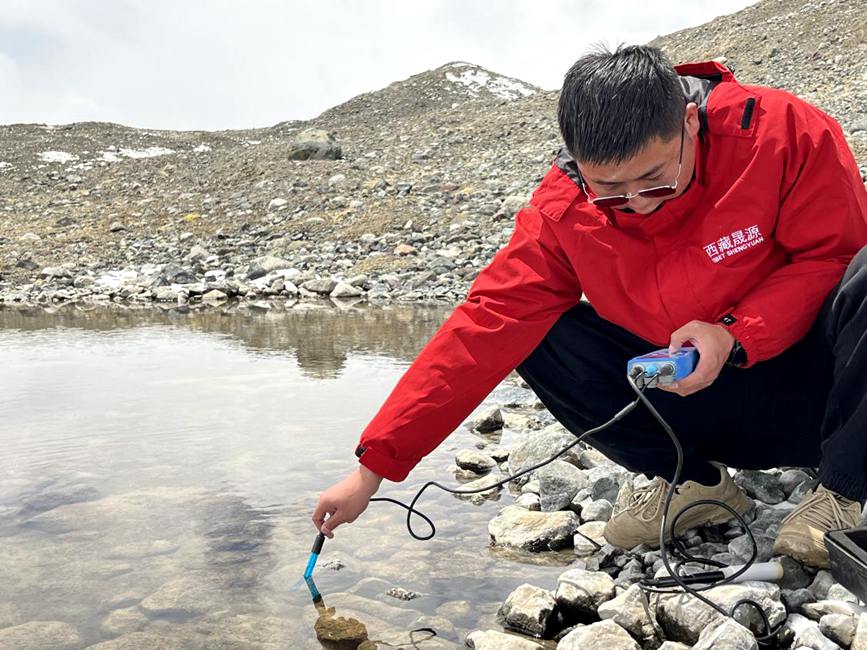 2022年5月10日,那曲市開展“江河源”生態(tài)保護工作,科研人員對長江源水質(zhì)進行檢測。王豐收 攝
