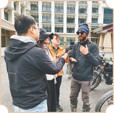 吉隆鎮(zhèn)上,記者偶遇一支由16輛摩托車、20余人組成的騎行車隊。領隊蘇詹·巴斯內特來自加德滿都,此行他帶著16名澳大利亞游客,駕駛摩托車環(huán)行中尼兩國邊境地區(qū)?!坝媱澬谐?1天,路程超過2500公里,將會途經游客們最為期待的拉薩、珠穆朗瑪峰景區(qū)等地?!卑退箖忍卣f。