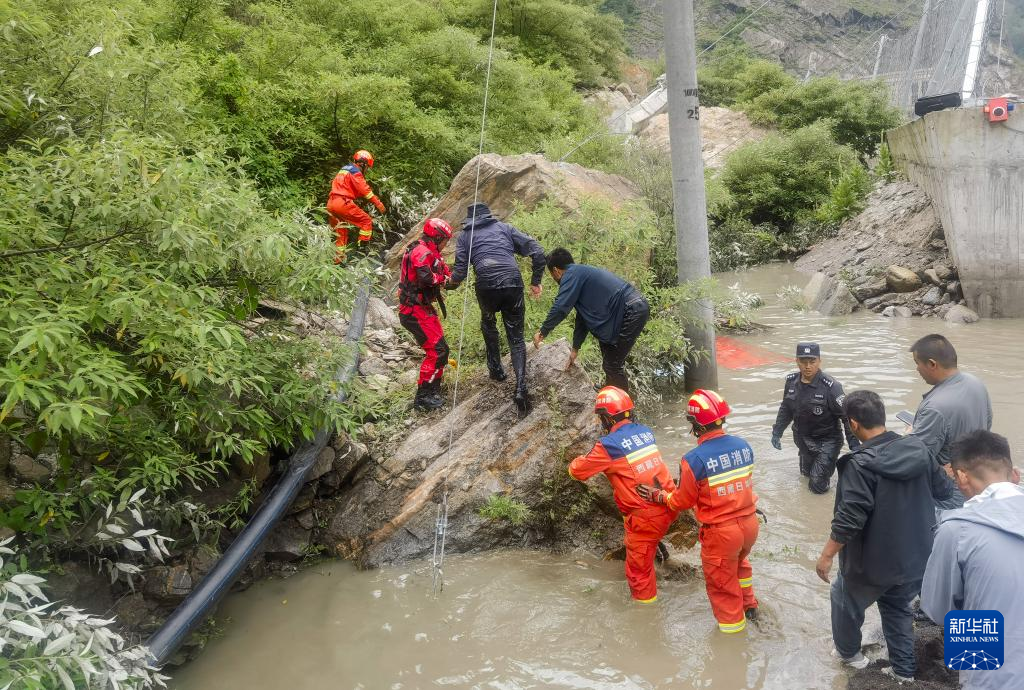 7月8日,西藏消防救援總隊救援人員在救災現(xiàn)場搭建救援通道。新華社發(fā)(徐達富攝)
