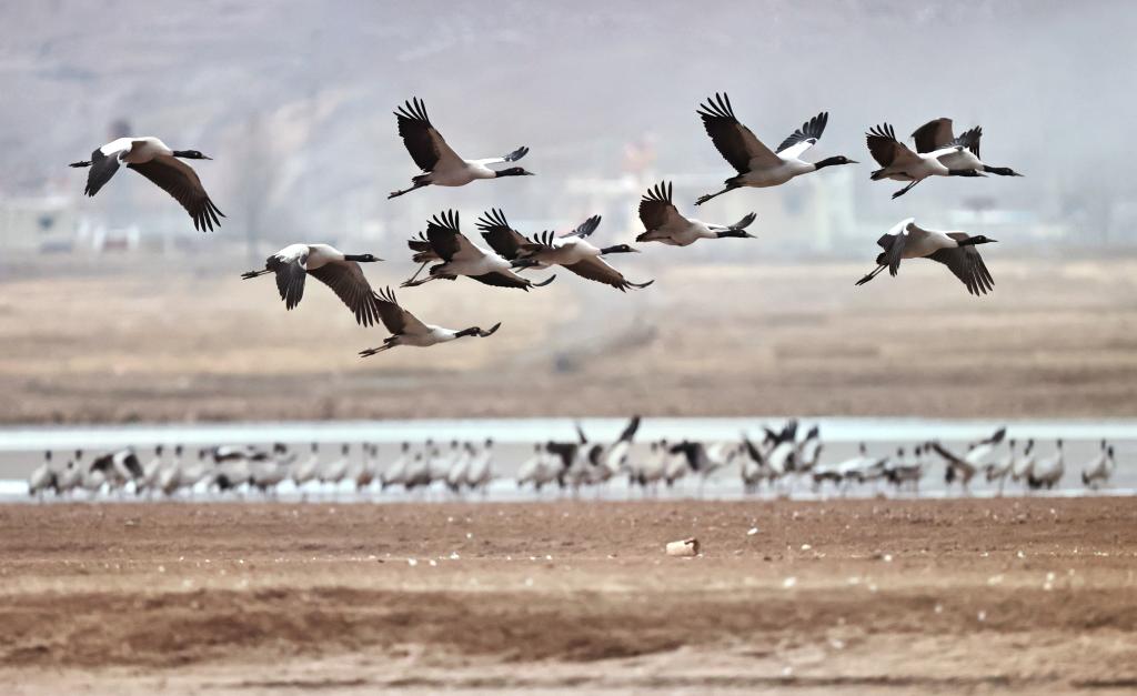 這是3月8日在拉薩市林周縣虎頭山水庫(kù)拍攝的黑頸鶴。新華社記者 丁增尼達(dá) 攝