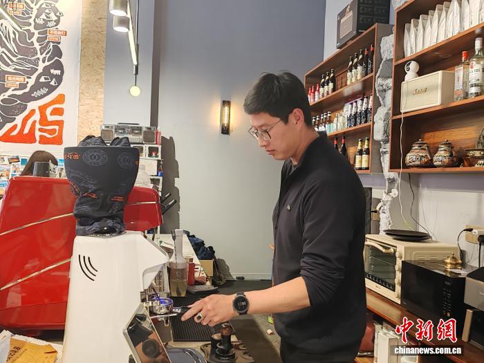 7月21日,劉博在他的店鋪內(nèi)操作咖啡機(jī)。中新社記者 陳建新 攝