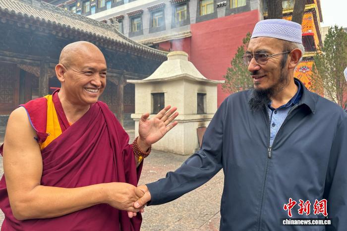 2024年7月,拉薩市政協(xié)副主席、清真大寺教長亞古(右)到訪青海省宏覺寺,與藏傳佛教僧人交流。(受訪者供圖)