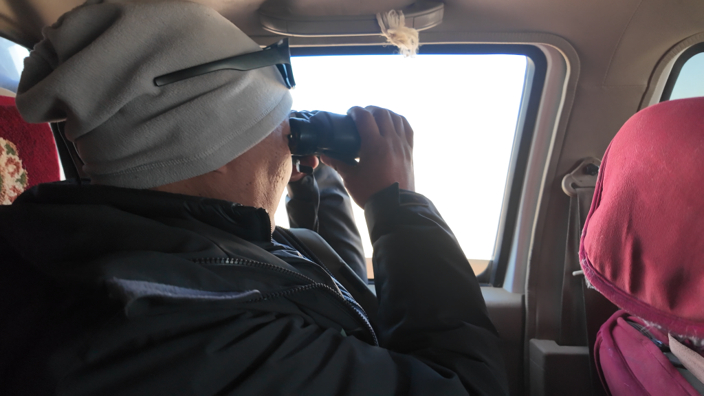 為了拍下野保員的日常工作以及藏羚羊大遷徙的宏大場面,我們一行跟隨巡護(hù)車,向著保護(hù)區(qū)核心區(qū)進(jìn)發(fā)。路面逐漸從“蜿蜒崎嶇的溪流”變成“波濤洶涌的大?!?,越野車內(nèi)好像一個(gè)迪斯科舞池,每一件東西都像被賦予了生命一般蹦蹦跳跳,伴隨著我們這些乘客的驚呼,連同引擎的轟鳴一起,揉碎在無邊荒原的呼嘯風(fēng)聲中。