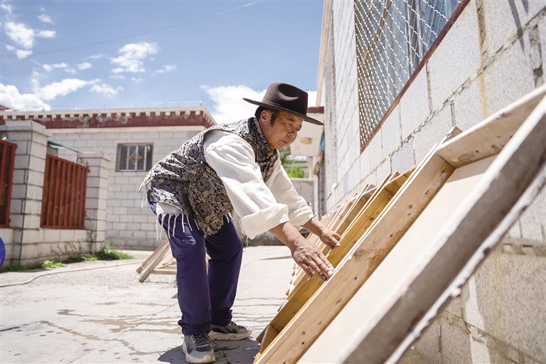 8月13日,記者來到尼木縣普松鄉(xiāng)曲水村的一個院落,58歲的斯曲正在窗邊埋頭雕刻,刻刀飛轉(zhuǎn)游走間,精致的花紋在木板上慢慢展現(xiàn),很快雕刻作品便初具雛形。作為普松雕刻第六代傳承人,斯曲自12歲起就在爺爺和爸爸的教導(dǎo)下開始學(xué)習(xí)這門手藝,如今的他早已成為普松雕刻自治區(qū)級非物質(zhì)文化遺產(chǎn)代表性傳承人。斯曲介紹,普松雕刻步驟煩瑣、工具講究,根據(jù)圖案復(fù)雜程度不同,耗時從6小時到3個月不等,十分考驗雕刻者的耐心。