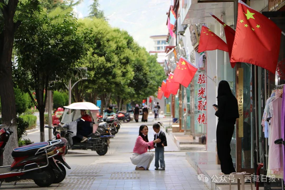 圖為山南市主城區(qū)沿街商鋪懸掛起鮮艷的五星紅旗慶祝西藏自治區(qū)成立60周年。記者 武沛濤 通訊員 擁青卓嘎 攝