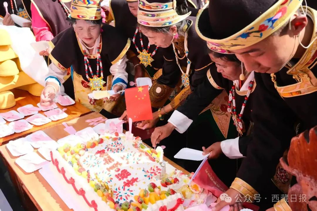 圖為林芝市巴宜區(qū)林芝鎮(zhèn)嘎拉村群眾歡聚一堂,分享寫(xiě)有“幸福嘎拉村”的蛋糕。記者 王珊 謝筱純 攝