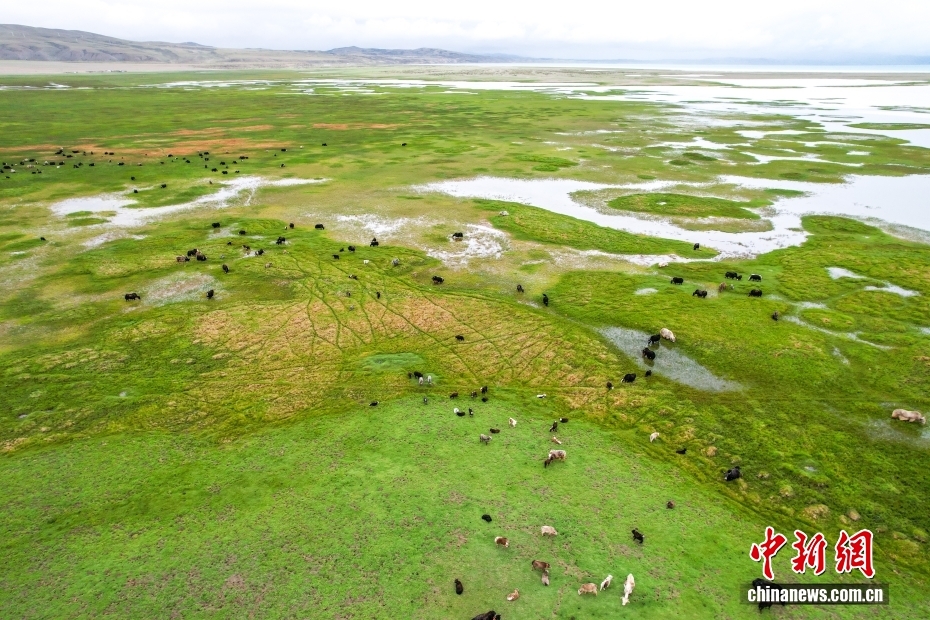 在西藏阿里地區(qū)普蘭縣霍爾鄉(xiāng),牧民在瑪旁雍錯(cuò)濕地上放牧牦牛。(無(wú)人機(jī)照片)中新社記者 張祥毅 攝