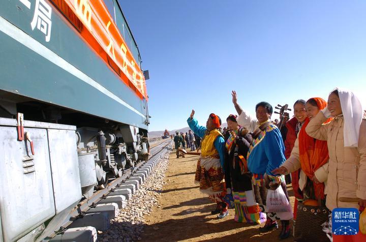 2004年10月10日,藏北群眾迎接火車抵達(dá)那曲。10月9日,青藏鐵路安多至那曲138公里鐵軌鋪設(shè)完成。10月10日,從安多出發(fā)的、西藏境內(nèi)第一列火車,于上午10時(shí)抵達(dá)當(dāng)時(shí)的藏北重鎮(zhèn)——那曲鎮(zhèn)。