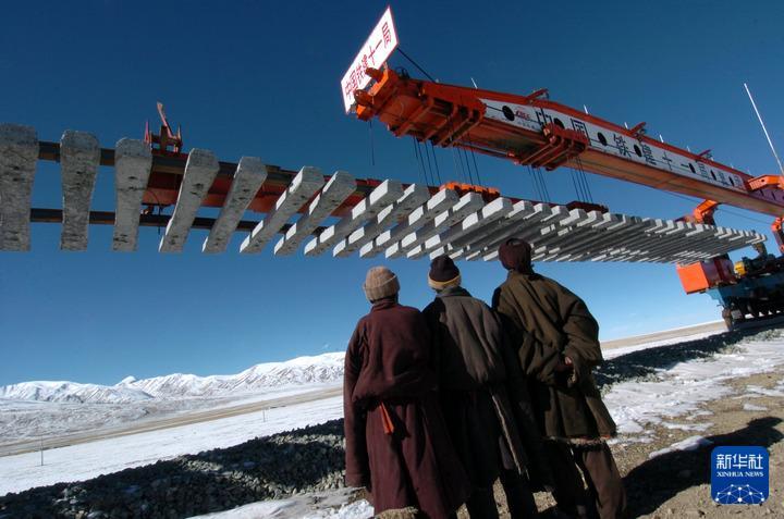 2004年12月5日,在西藏那曲境內(nèi),藏族群眾觀看青藏鐵路鐵軌鋪設(shè)過(guò)程。
