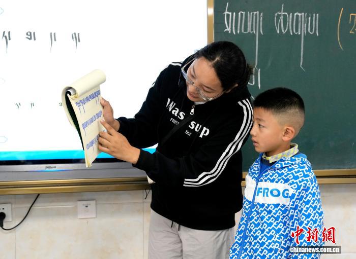 9月1日,拉薩市第一小學(xué)一年級二班,藏語文老師扎西央欽正在輔導(dǎo)學(xué)生。近日,西藏拉薩市秋季學(xué)期開學(xué),各項教學(xué)工作有序開展。中新社記者 李林 攝