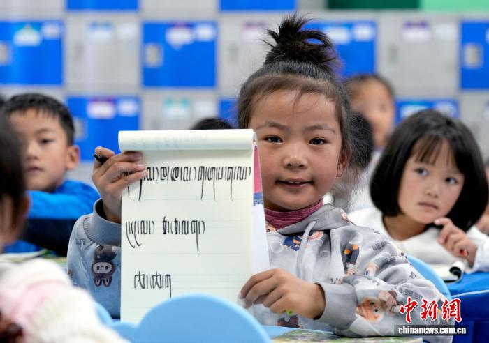 9月1日,拉薩市第一小學(xué)一年級二班的學(xué)生展示在藏語文課上書寫的藏文。近日,西藏拉薩市秋季學(xué)期開學(xué),各項教學(xué)工作有序開展。中新社記者 李林 攝