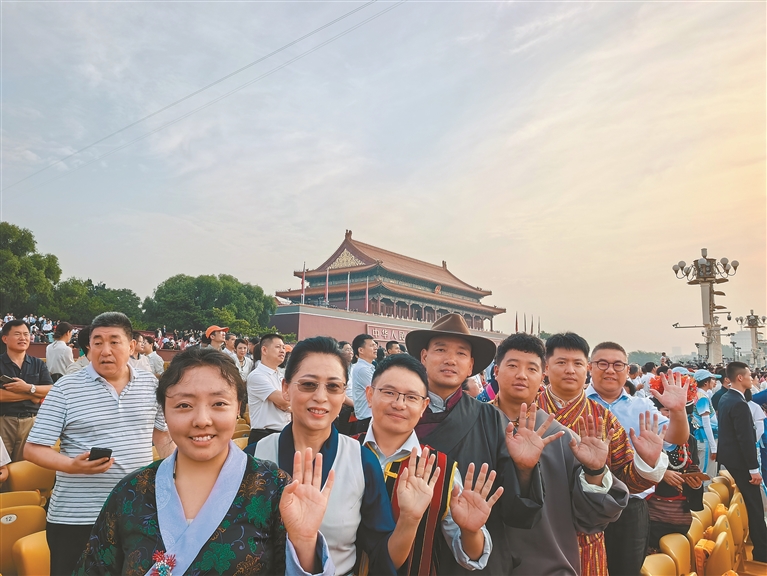 圖為9月3日,西藏代表團成員在觀禮臺上合影留念。記者 央金 通訊員 強巴扎西 攝