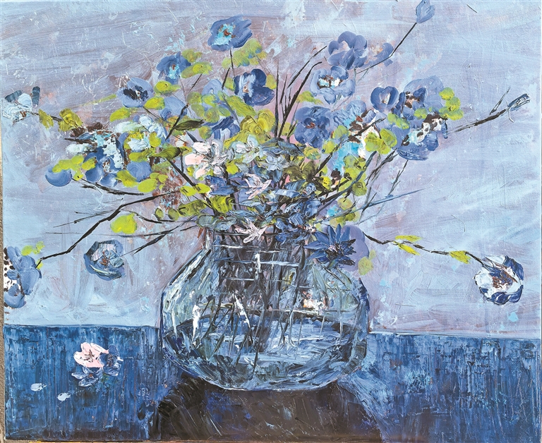 羽芊的畫作《老瓶與玫瑰》。