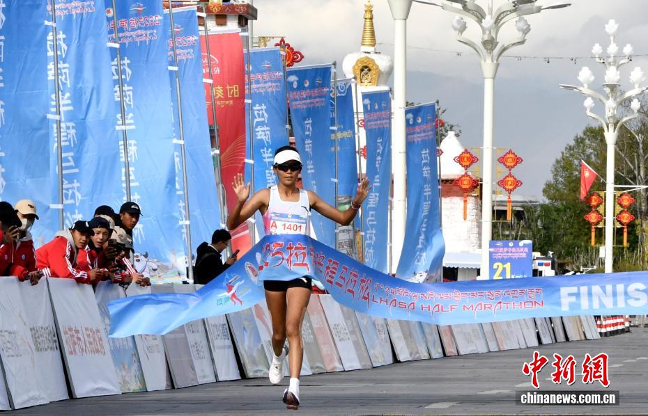 9月21日,2025拉薩半程馬拉松在西藏自治區(qū)會展中心鳴槍開跑。本次賽事設(shè)置半程馬拉松(21.0975公里)、競速跑(10公里)和健康跑(5公里)三個組別,參賽規(guī)模7000人。圖為半程馬拉松女子組第一名央增拉姆沖破終點線瞬間。中新社記者 李林 攝