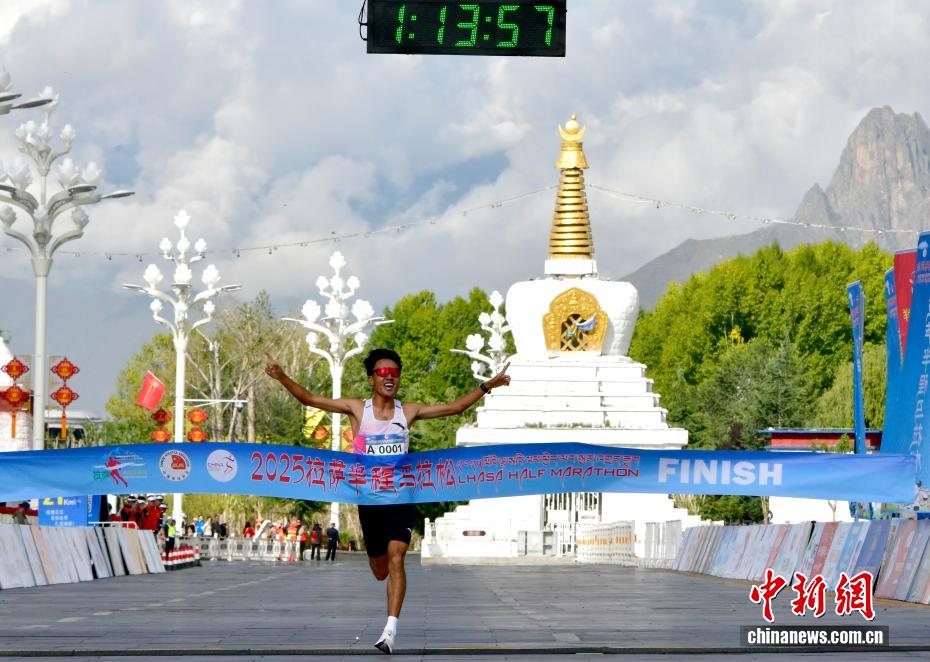 9月21日,2025拉薩半程馬拉松在西藏自治區(qū)會展中心鳴槍開跑。本次賽事設(shè)置半程馬拉松(21.0975公里)、競速跑(10公里)和健康跑(5公里)三個組別,參賽規(guī)模7000人。圖為半程馬拉松男子組第一名頓珠次仁沖破終點線瞬間。中新社記者 李林 攝