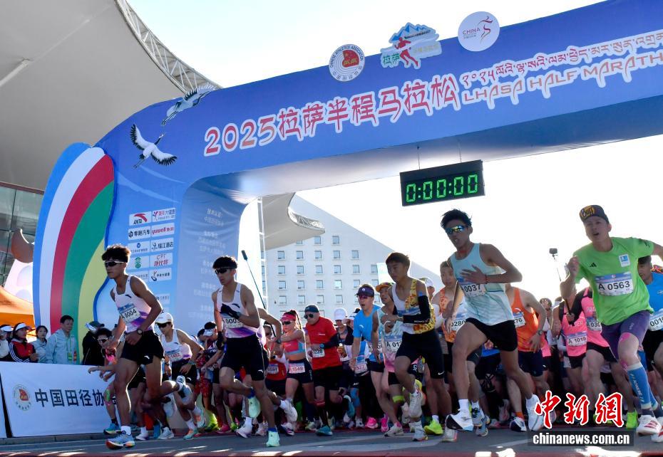 9月21日,2025拉薩半程馬拉松在西藏自治區(qū)會展中心鳴槍開跑。本次賽事設(shè)置半程馬拉松(21.0975公里)、競速跑(10公里)和健康跑(5公里)三個組別,參賽規(guī)模7000人。圖為2025拉薩半程馬拉松鳴槍開跑。中新社記者 李林 攝