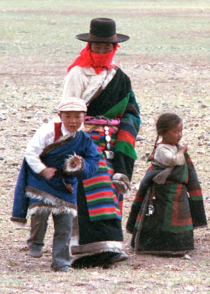 1987年,在西藏那曲地區(qū)文部辦事處(現(xiàn)那曲市尼瑪縣)賽馬會上,小男孩次仁石達(左一)和她阿媽達曲(中)在一起。新華社記者 唐召明 攝