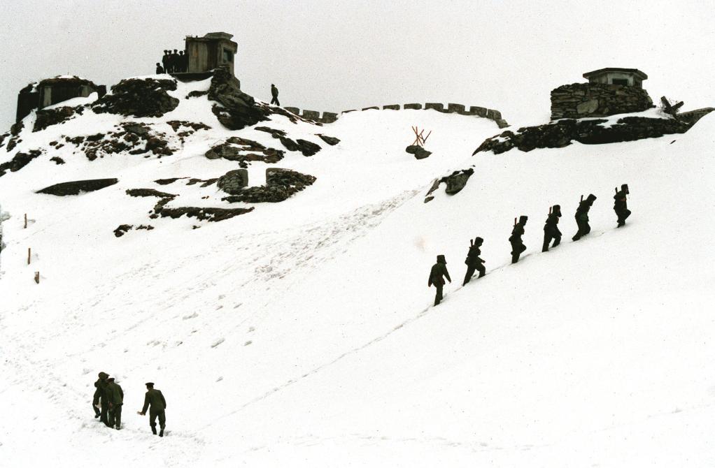 西藏乃堆拉哨所終年被積雪覆蓋,巡邏的士兵在雪地上艱難地跋涉。(1992年6月25日發(fā))