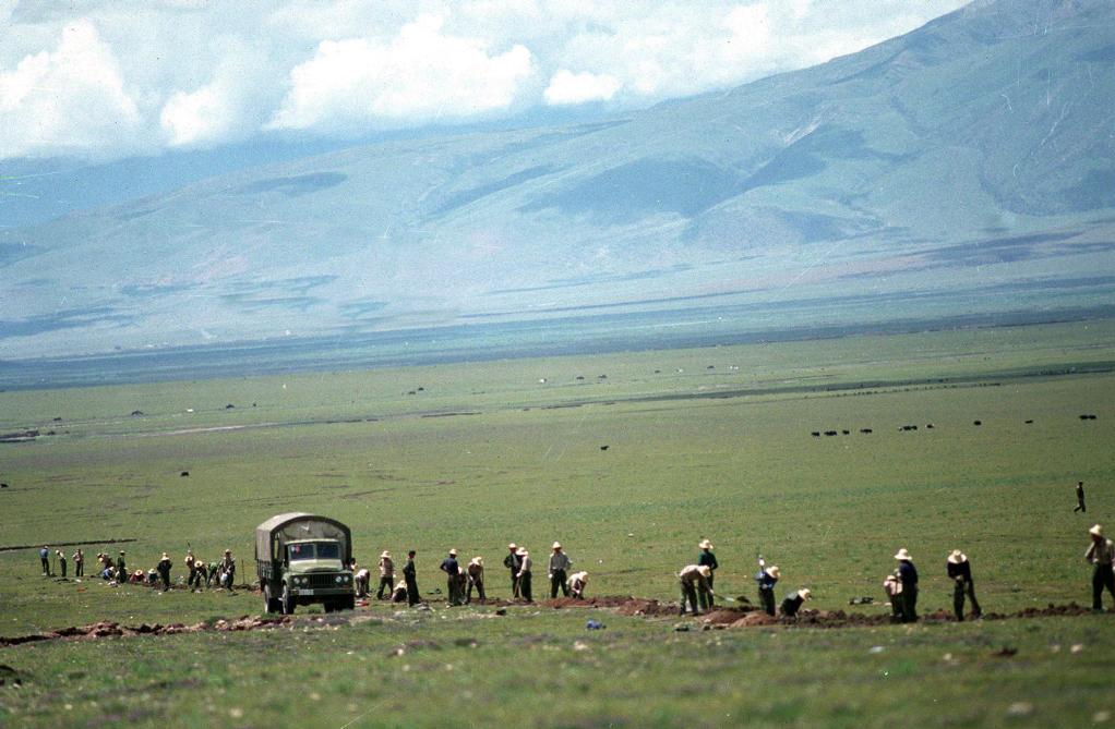 蘭州——西寧——拉薩光纜工程,從1997年7月開始施工。這是工人和駐藏部隊官兵在海拔4000多米的藏北草原上準(zhǔn)備鋪設(shè)光纜的情景。(1997年9月18日發(fā))