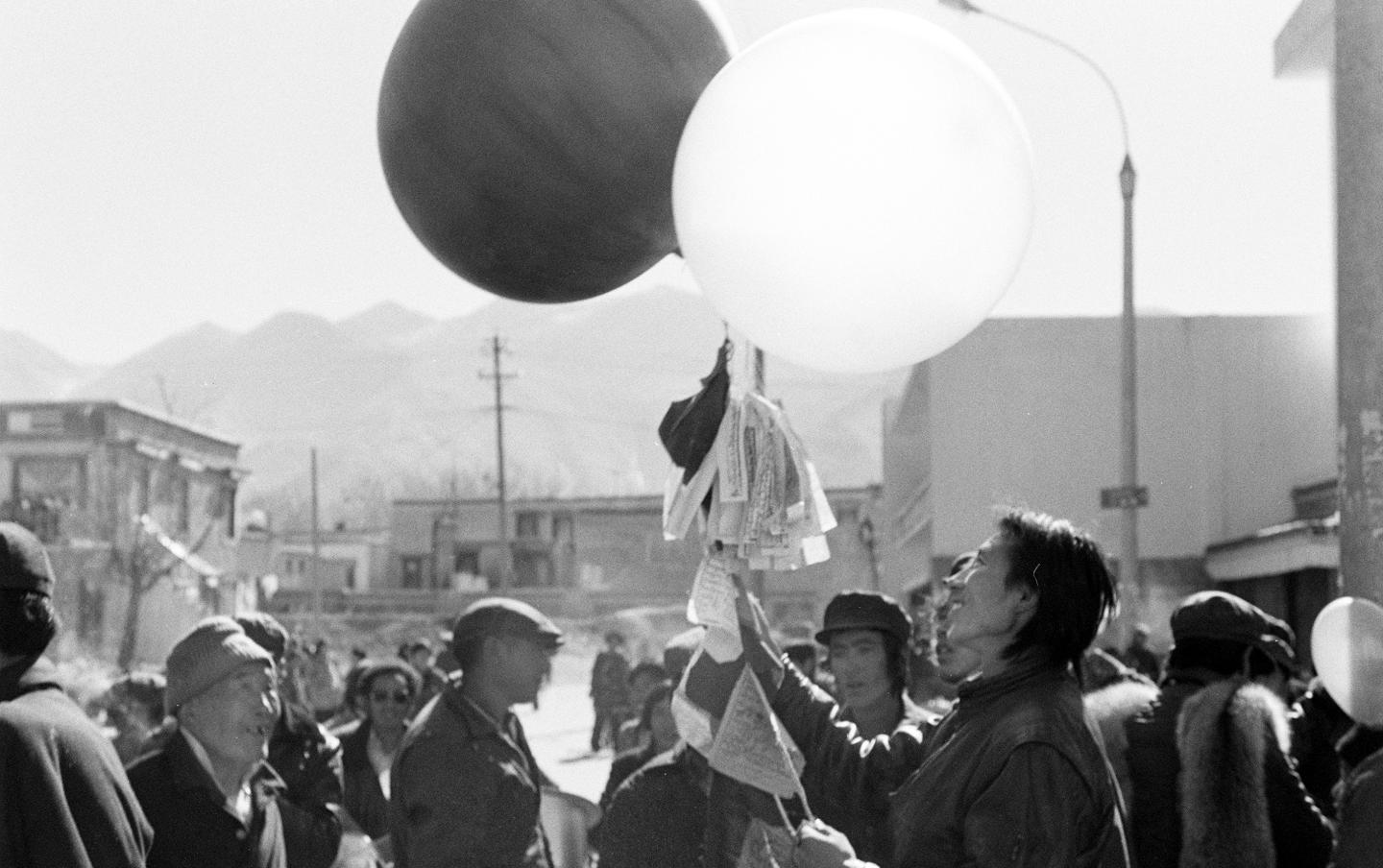 1989年新年伊始,拉薩市街頭出現(xiàn)了賣大氣球的個體戶,藏族市民喜歡將經(jīng)幡掛在彩色氣球下,放飛空中。