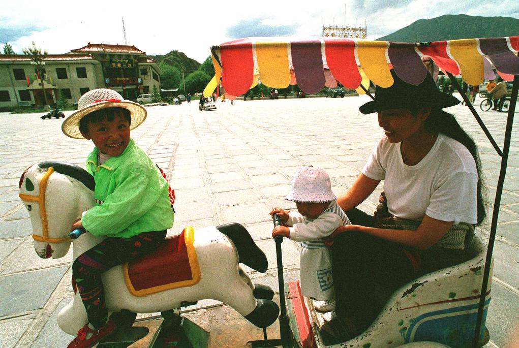 在拉薩市布達拉宮廣場,這家藏族母女三人在乘坐兒童電動車游玩娛樂(1997年11月13日發(fā))。