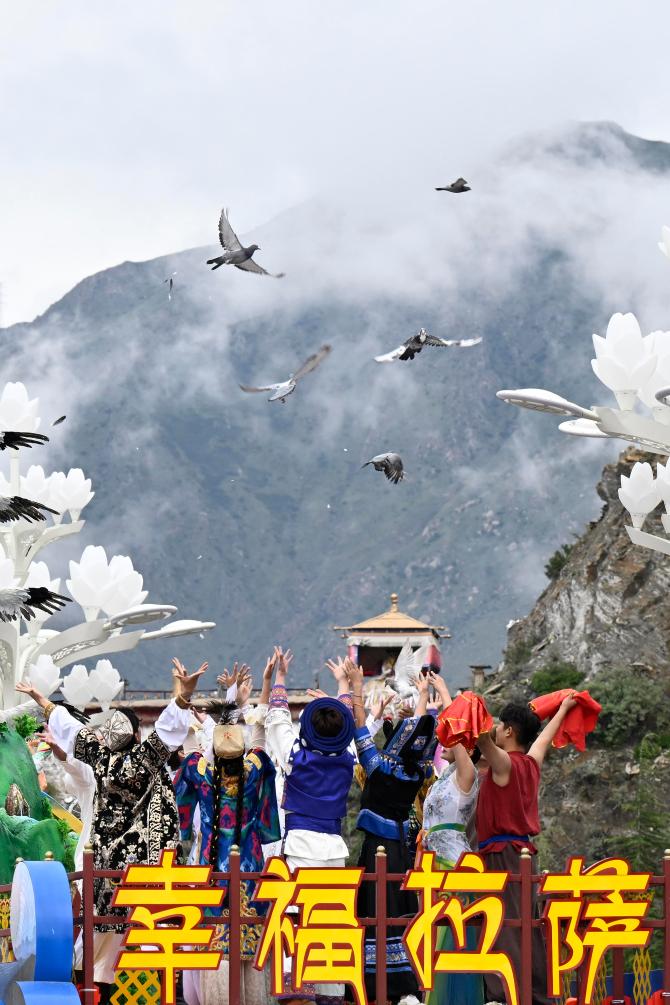2025年8月21日上午,西藏各族各界干部群眾約2萬人歡聚拉薩市布達拉宮廣場,熱烈慶祝西藏自治區(qū)成立60周年。這是彩車上的演員通過布達拉宮廣場時放飛鴿子。新華社記者 申宏 攝