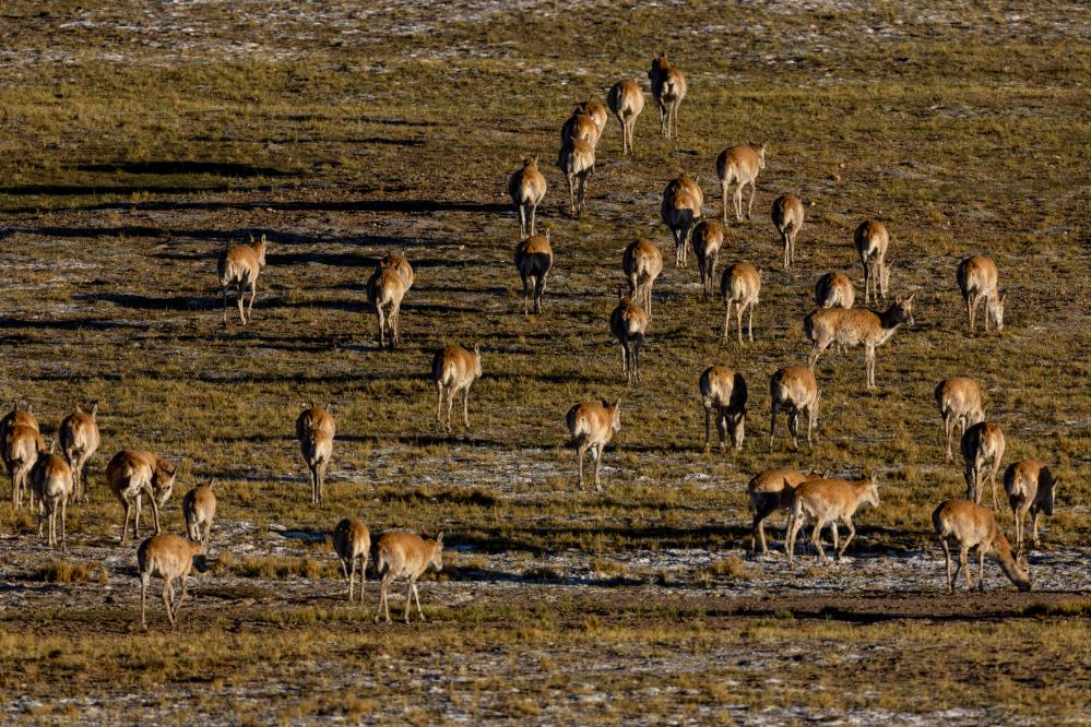 羌塘國家級自然保護區(qū)核心區(qū)繁殖遷徙路上的雌性藏羚羊群。(2025年6月10日攝)。新華社記者 姜帆 攝