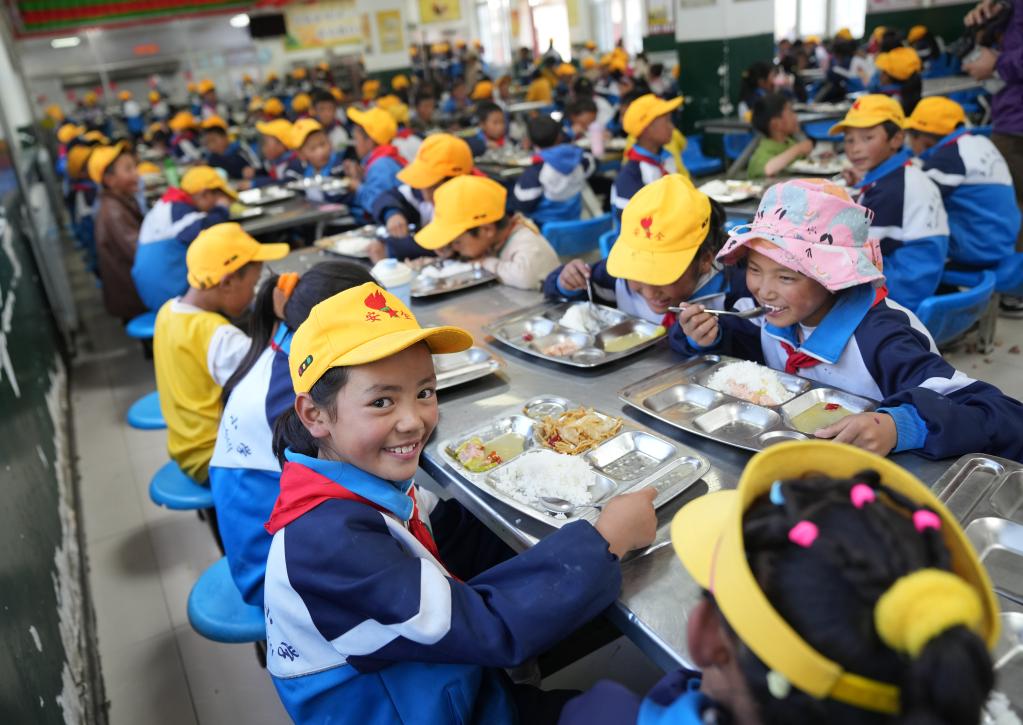 西藏林芝市工布江達縣娘蒲鄉(xiāng)中心小學(xué)學(xué)生在食堂用餐(2024年9月3日攝)。 新華社記者 晉美多吉 攝
