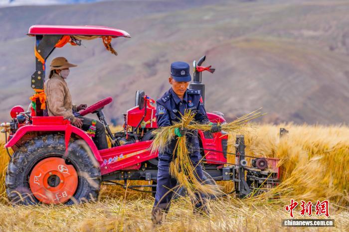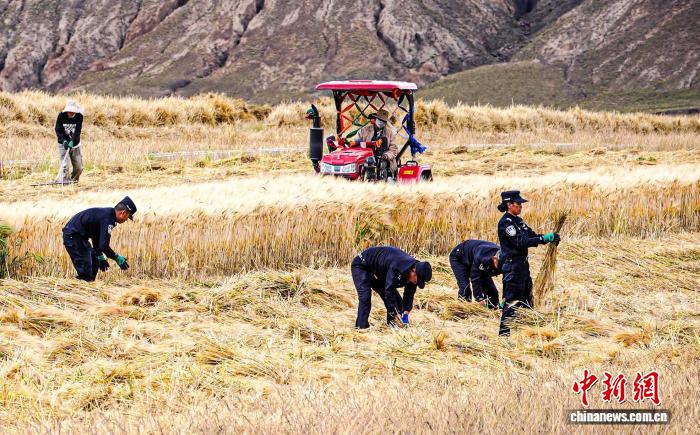 圖為民警在田間搶收青稞。葉軼 攝