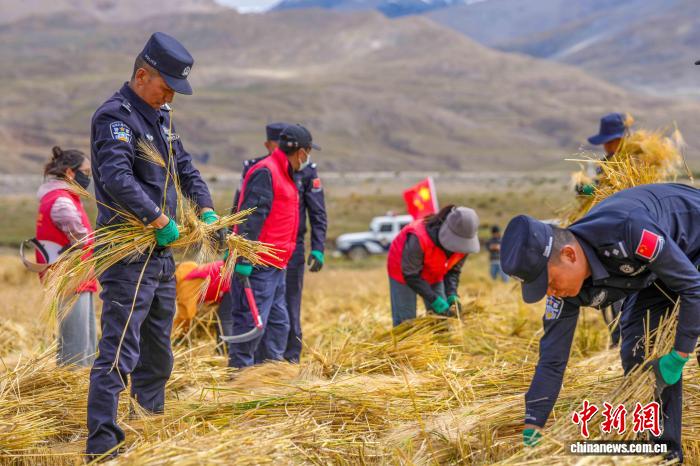 金秋時節(jié),青稞飄香。23日,西藏日喀則邊境管理支隊涅如麥邊境派出所民警們深入田間,在廣袤的田野上,與農牧民一同俯身勞作,揮鐮收割,搶收青稞。