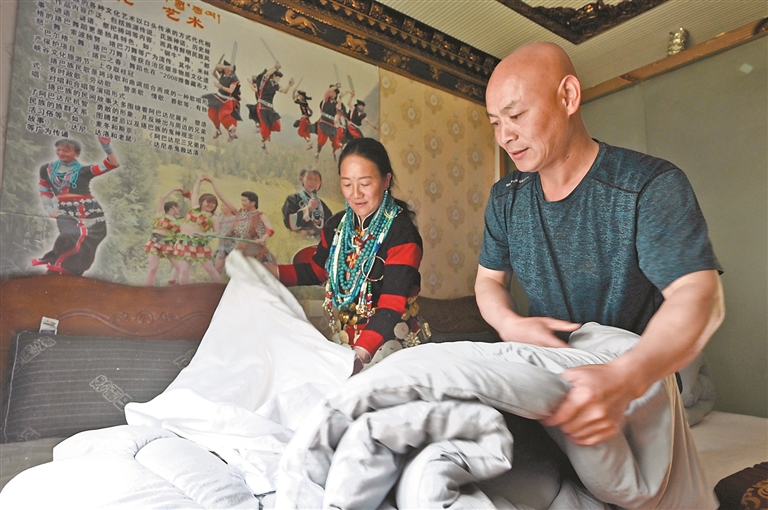 米林市南伊珞巴民族鄉(xiāng),亞達兒與丈夫鄭定全在整理民宿房間。記者 白瑪澤旺 攝
