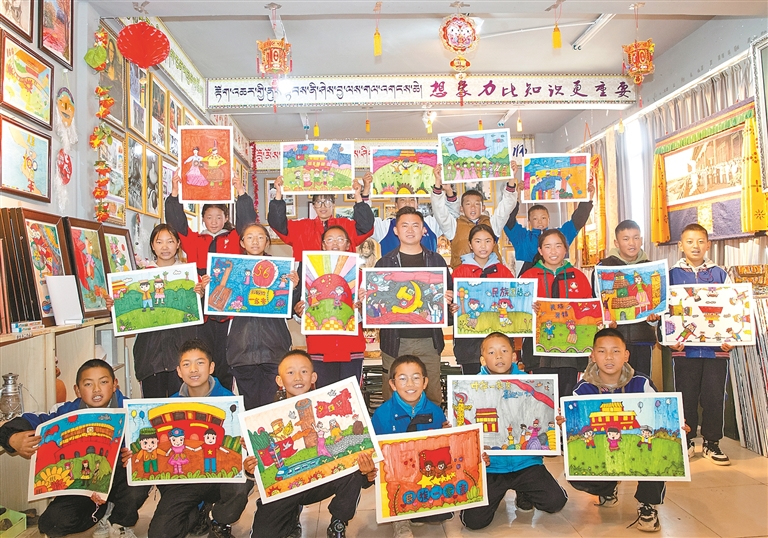 山南市桑日縣中學美術(shù)興趣社團的學生展示自己的以“鑄牢中華民族共同體意識”為主題的繪畫作品。記者 洛桑 通訊員 次仁龍布 攝