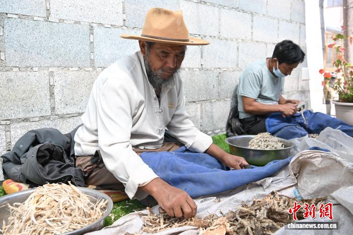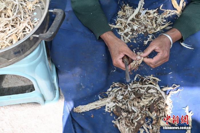 圖為雪拉村村民在給狼毒草根去皮。中新社記者 貢嘎來松 攝
