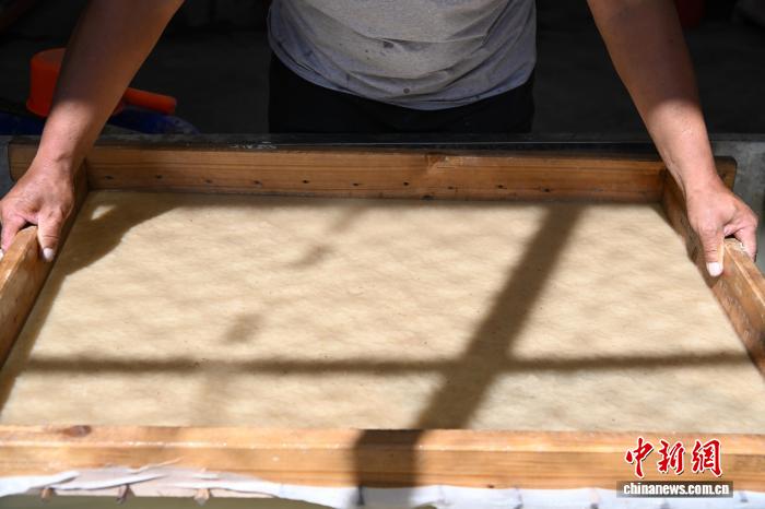 10月16日,“共建中華民族共同體書寫美麗西藏新篇章——魅力新拉薩 幸福高原城”暨中央媒體和網(wǎng)絡(luò)名人采風(fēng)活動走進(jìn)西藏自治區(qū)拉薩市尼木縣尼木雪拉藏紙農(nóng)牧民專業(yè)合作社采訪中國國家級非物質(zhì)文化遺產(chǎn)代表性項(xiàng)目藏族造紙技藝。據(jù)悉,藏紙傳承至今已有1300多年歷史,雪拉藏紙作為西藏三大藏紙之一,其特殊原料配方造就“蟲不蛀、鼠不咬、不腐不變色”的特性,用它印制的文史經(jīng)典千余年完好如初。圖為尼木雪拉藏紙農(nóng)牧民專業(yè)合作社員工在制作藏紙。中新社記者 貢嘎來松 攝