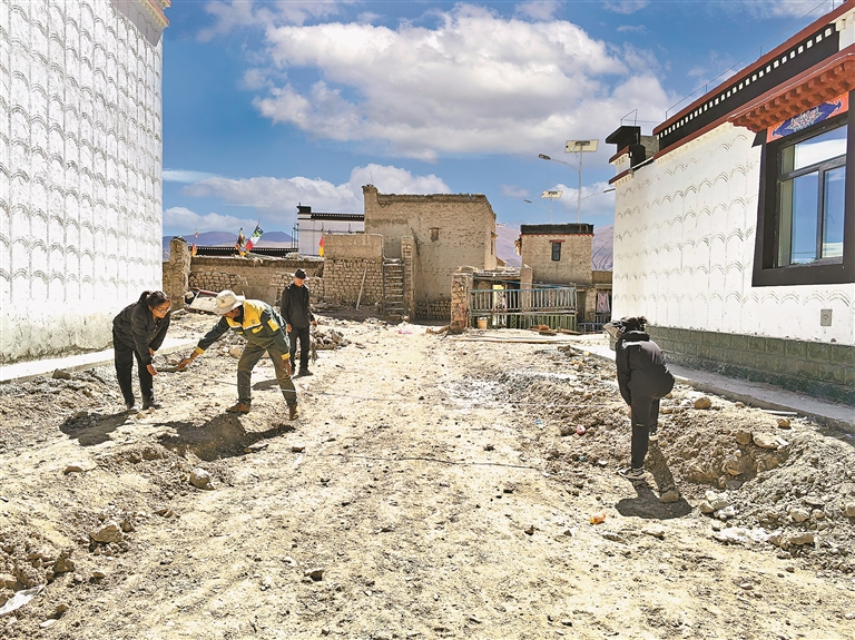 拉孜縣查務(wù)鄉(xiāng)那布西村干部、駐村工作隊(duì)隊(duì)員測量重建后的村道距離,初步確定群眾圍墻修建范圍。