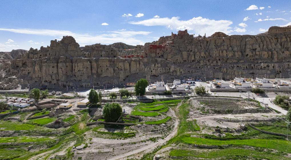 皮央石窟群與山下的村莊相互映襯(無人機(jī)照片)。新華社記者 丁增尼達(dá) 攝