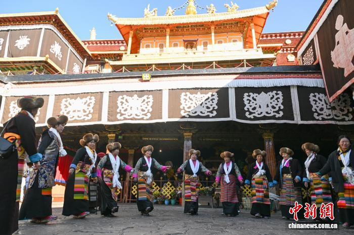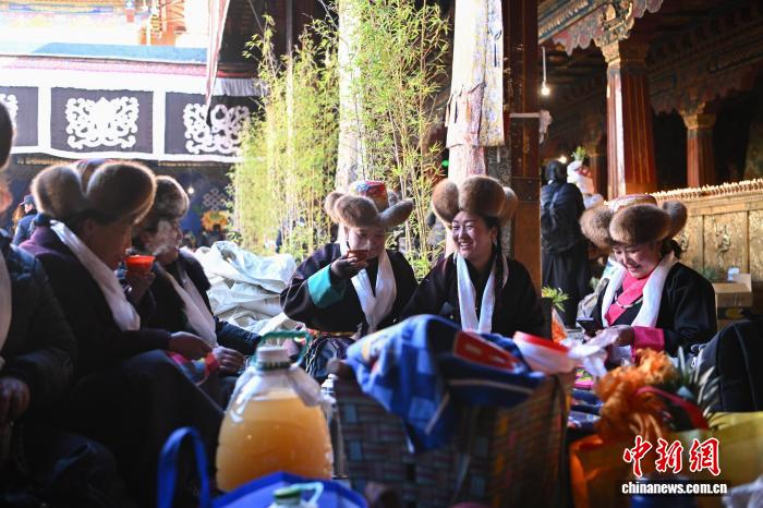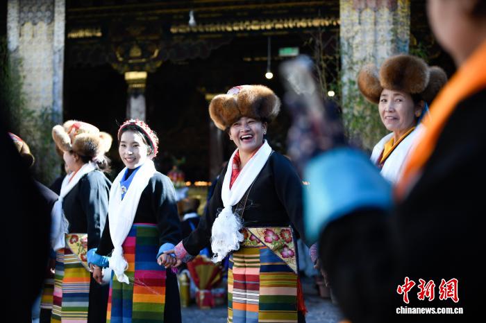 隨著藏歷十月十五白拉姆節(jié)(又稱“仙女節(jié)”)臨近,11月28日,西藏拉薩的婦女們?cè)诖笳阉绿陚鹘y(tǒng)舞蹈后休息,迎接“仙女節(jié)”到來(lái)?!跋膳?jié)”即吉祥天母節(jié),藏語(yǔ)稱“白來(lái)日追”。相傳藏傳佛教最高護(hù)法神之一班丹拉姆的女兒白拉姆,不顧母親的反對(duì)與赤尊贊私定終身,班丹拉姆一怒之下將赤尊贊趕到拉薩河南岸,規(guī)定二人僅每年的藏歷十月十五日相見(jiàn)。中新社記者 貢嘎來(lái)松 攝