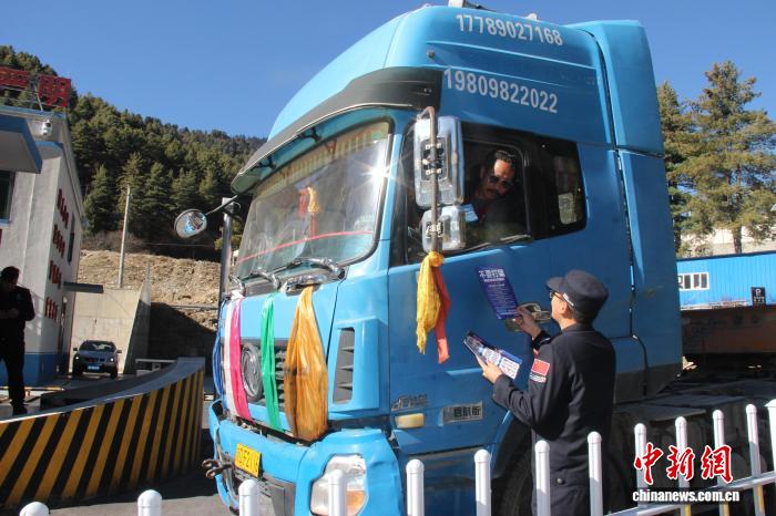 圖為西藏邊檢總站執(zhí)法調查支隊民警向過往車輛駕駛員開展宣傳。西藏邊檢總站執(zhí)法調查支隊供圖