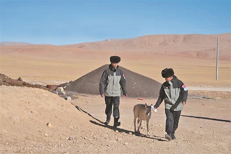 圖為雄熱管護站管護員及救助的小藏羚羊。記者 萬靖 攝