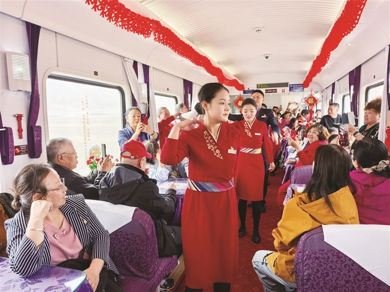 針對(duì)高原旅游特殊性及“銀發(fā)族”為主的客群特點(diǎn),中國鐵路青藏集團(tuán)有限公司持續(xù)升級(jí)服務(wù)保障體系,讓旅途兼具安全性與舒適度。車輛方面,該公司完成適老化與舒適化改造,打造2組普惠型旅游專用車組,入藏專列均采用全列有氧臥鋪車廂,配備彌散式供氧系統(tǒng)、專用發(fā)電車及精品餐車,有效緩解旅客高原反應(yīng)。服務(wù)方面,該公司組建“導(dǎo)游+乘務(wù)+醫(yī)護(hù)”三位一體復(fù)合型服務(wù)團(tuán)隊(duì),全程提供健康監(jiān)測(cè)、文化講解、應(yīng)急保障等全流程陪伴服務(wù);車廂內(nèi)以民族紋飾、剪紙窗花營造地域氛圍,文藝小分隊(duì)沿途獻(xiàn)上藏族歌曲、舞蹈等特色表演,餐車則供應(yīng)烤羊腿、牦牛酸奶、特色奶茶等地方風(fēng)味美食,讓旅程更加舒適美好。運(yùn)營模式上,該公司采用“晚上開行、白天游玩、邊走邊?!钡脑O(shè)計(jì),途經(jīng)玉珠峰、沱沱河、羌塘草原等高原奇景,在海拔5072米的唐古拉站、措那湖等標(biāo)志性地點(diǎn)定點(diǎn)停靠,讓游客在休息中跨越山海,充分領(lǐng)略雪域風(fēng)光。同時(shí),該公司強(qiáng)化公鐵聯(lián)運(yùn)與景區(qū)接駁,推出“旅游小管家”一站式服務(wù),確保游客“行得順暢、吃得地道、玩得盡興”。