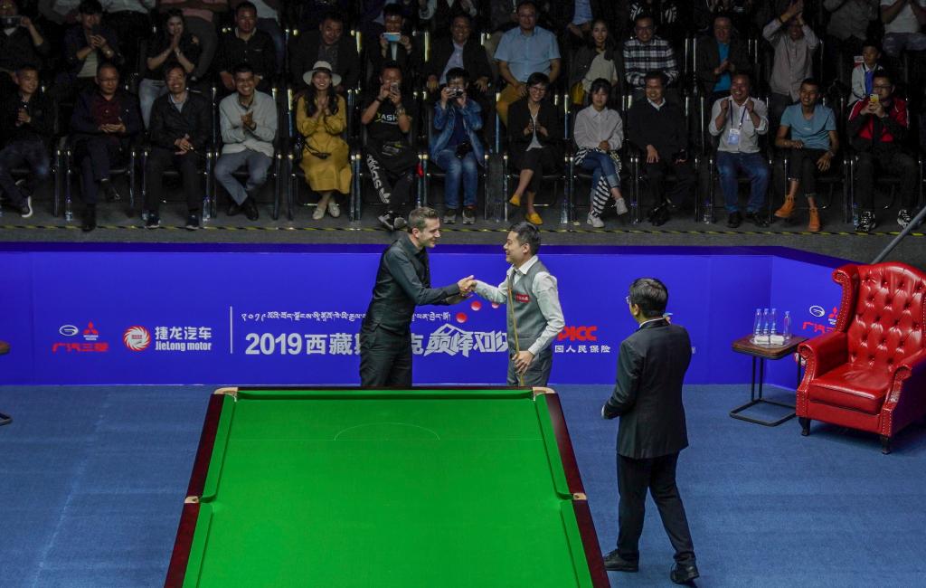 2019西藏斯諾克巔峰對(duì)決比賽中,塞爾比(左一)祝賀丁俊暉單桿打出147的滿分。新華社記者 晉美多吉 攝
