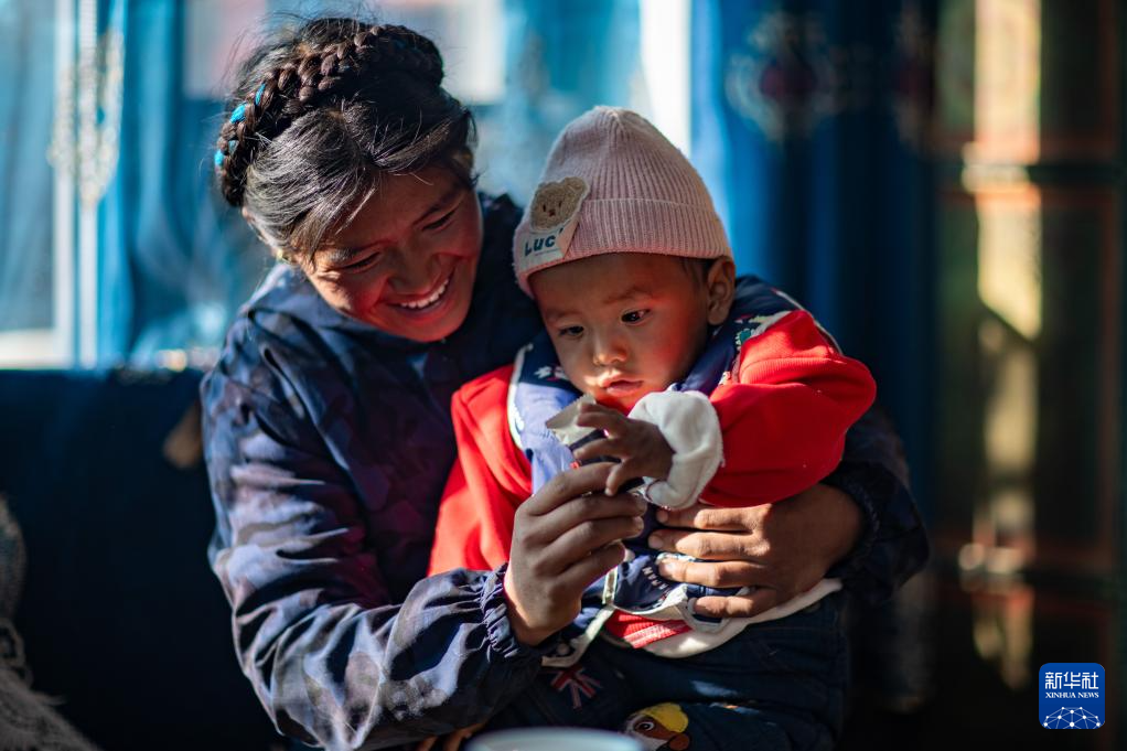 1月5日,在西藏定日縣長所鄉(xiāng)雜村,母親朋瓊在家中逗弄次仁拉巴。新華社記者 姜帆 攝
