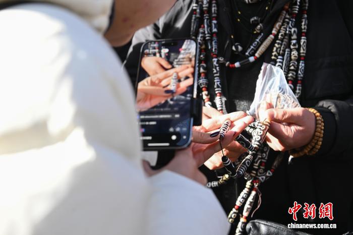 圖為商人在沖賽康露天集市直播賣天珠。中新社記者 貢嘎來松 攝