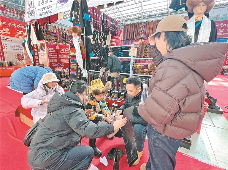 圖為市民在博覽會(huì)上為孩子選購(gòu)藏帽、藏靴。記者 央金 攝