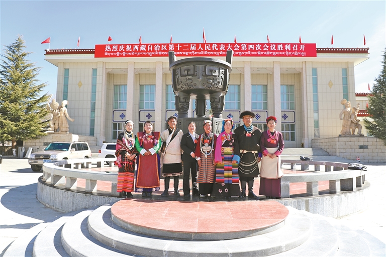 1月31日,來自7個民族的8位自治區(qū)人大代表,相“約”來到民族團結(jié)寶鼎前,暢聊民族團結(jié)進步事業(yè)并合影,大家相約來年再聚。左起:玉珍(僜人)、次仁普只(門巴族)、加凳(藏族)、成海宏(漢族)、仁增(夏爾巴人)、仁青措珍(納西族)、達娃(珞巴族)、斗卓瑪(門巴族)。 西藏自治區(qū)人大宣傳中心 德吉曲珍 徐亮 攝
