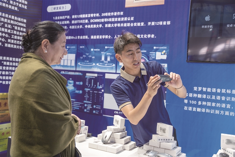 西藏覺羅數(shù)字產(chǎn)業(yè)管理有限公司工作人員正在介紹公司產(chǎn)品。