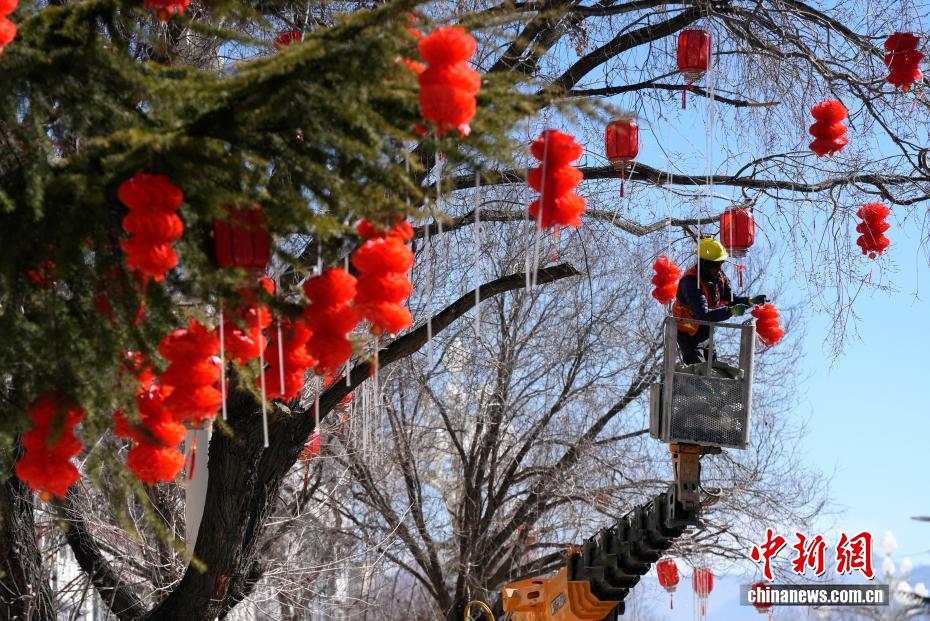 2月3日,西藏拉薩,工人沙吉頓珠正在掛燈籠。隨著春節(jié)、藏歷新年的臨近,拉薩城區(qū)大街小巷被精心裝點(diǎn),年味愈發(fā)濃郁。中新社記者 李林 攝