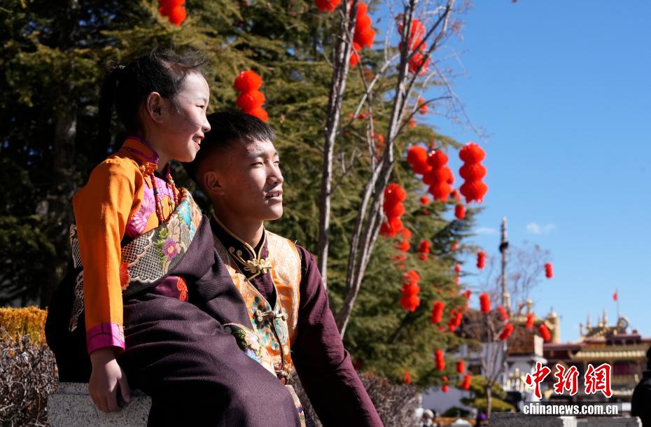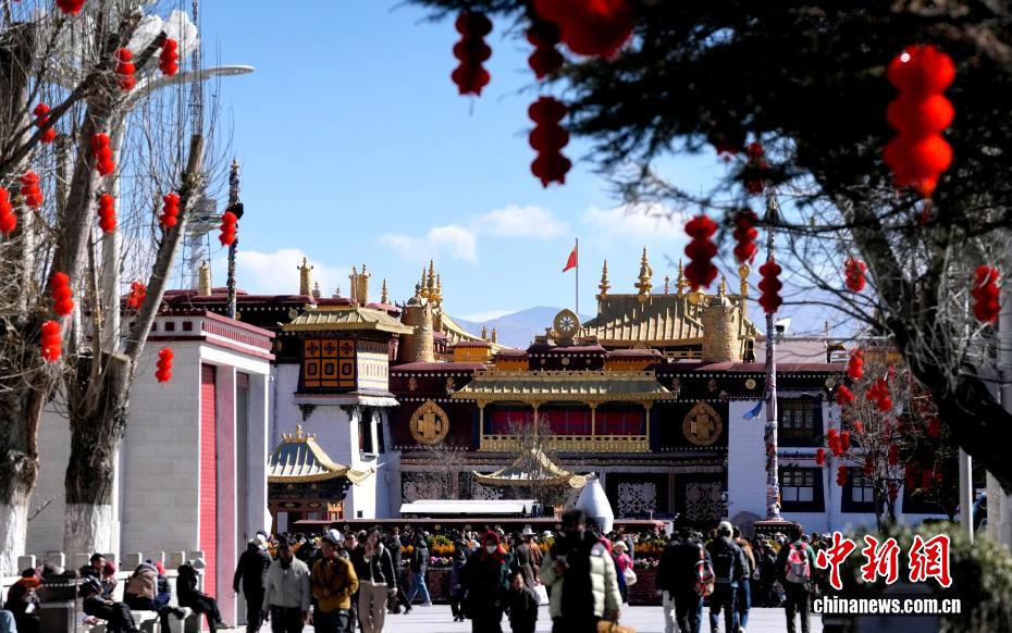 2月3日,西藏拉薩,民眾在大昭寺廣場拍照。隨著春節(jié)、藏歷新年的臨近,拉薩城區(qū)大街小巷被精心裝點(diǎn),年味愈發(fā)濃郁。中新社記者 李林 攝