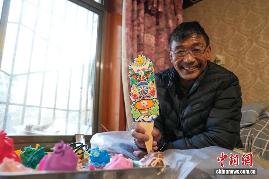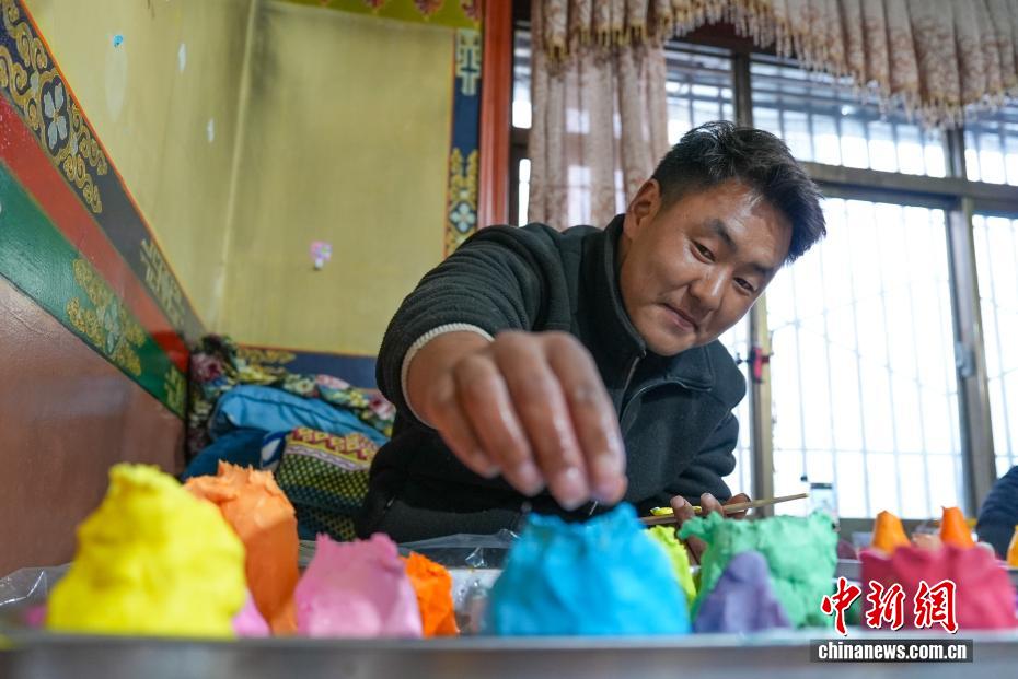 2月4日,隨著藏歷新年臨近,拉薩街頭年味漸濃,年貨市場(chǎng)上的“孜扎”迎來(lái)熱銷。酥油花藏語(yǔ)稱“孜扎”,是藏歷新年吉祥物切瑪盒的重要組件,也是藏族民眾家中必備的年貨。酥油花以酥油為主要原料,由匠人純手工捏制而成,造型涵蓋佛像、人物、花卉樹(shù)木、飛禽走獸等,常見(jiàn)圖案包含吉祥八寶、和諧四瑞、長(zhǎng)壽圖等,承載著藏族民眾對(duì)新年平安吉祥、萬(wàn)事順?biāo)斓拿篮闷碓?。圖為手工藝人在制作酥油花。貢確 攝